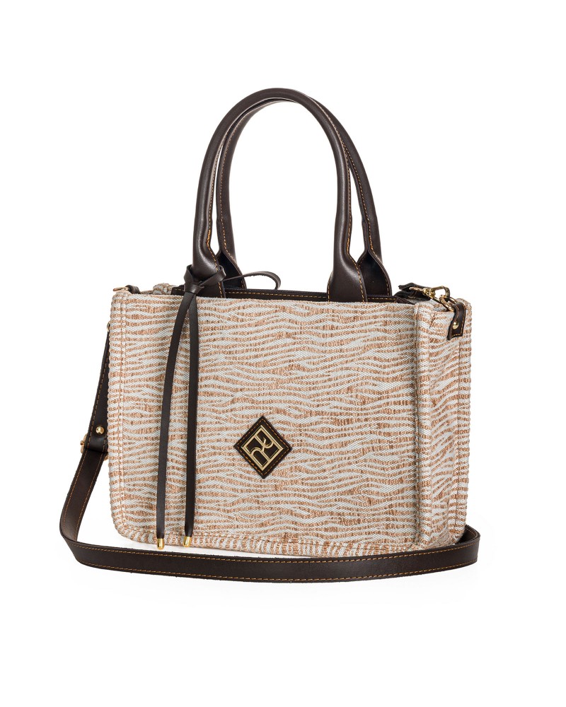 Αυτή η τσάντα τύπου tote είναι ο ιδανικός συνδυασμός λειτουργικότητας και υψηλής αισθητικής. Με ένα μοναδικό μοτίβο που θυμίζει "animal print" σε γήινες αποχρώσεις, αποτελεί μια σοφιστικέ επιλογή για τη γυναίκα που θέλει να ξεχωρίζει στην καθημερινότητά της.